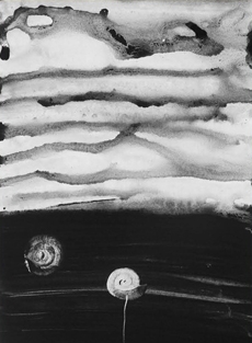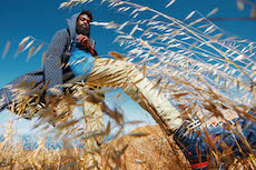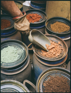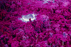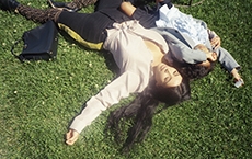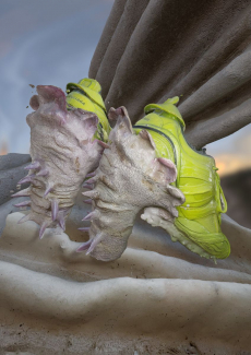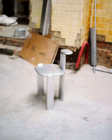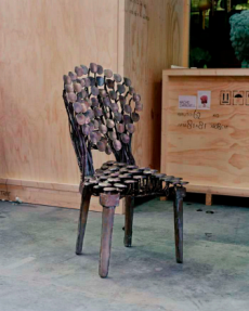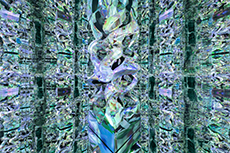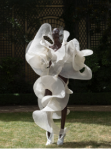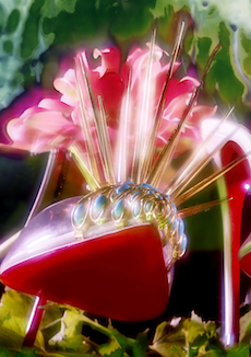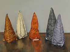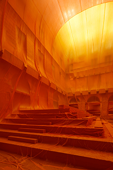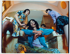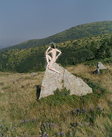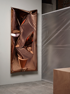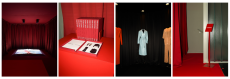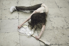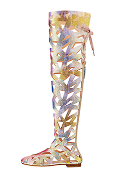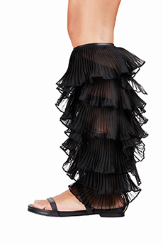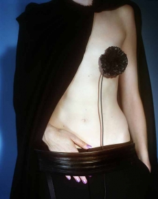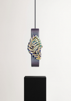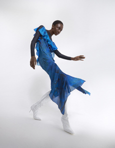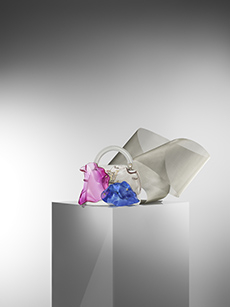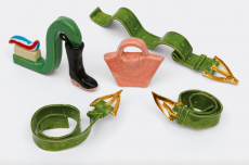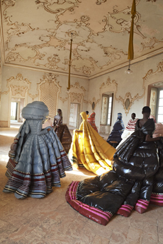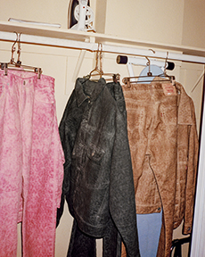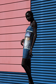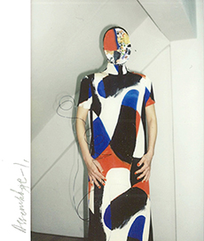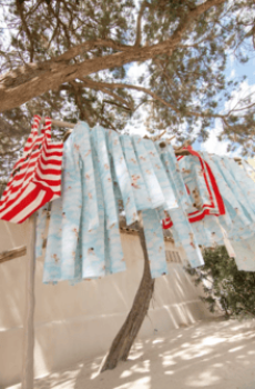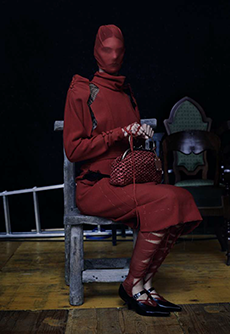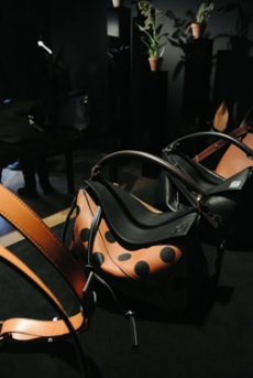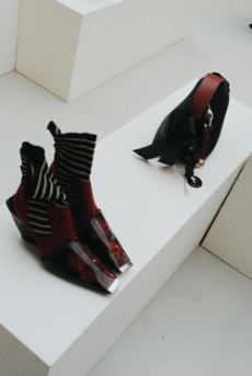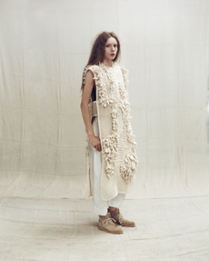 Knit and washed leather dresses are pierced with trailing of coloured lacing in silk, resembling the tradition of fastening a strip of cloth on a tree as votive offering, the wishing tree.