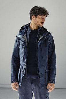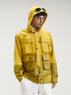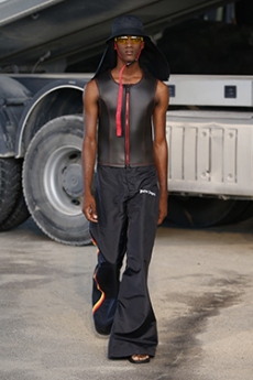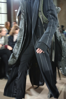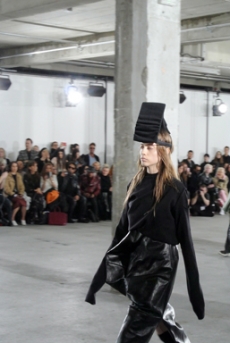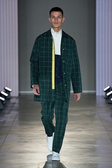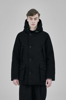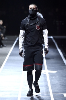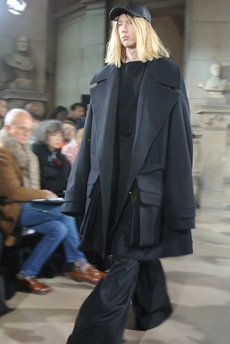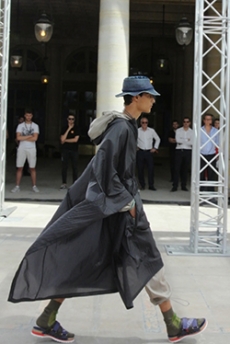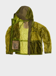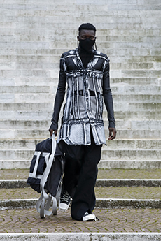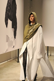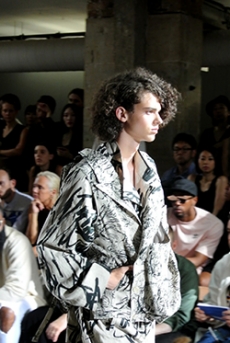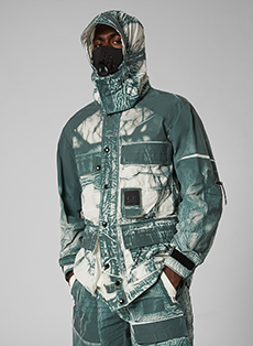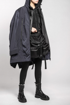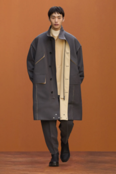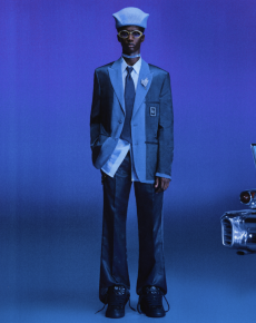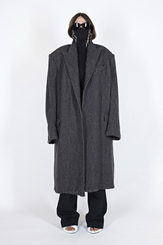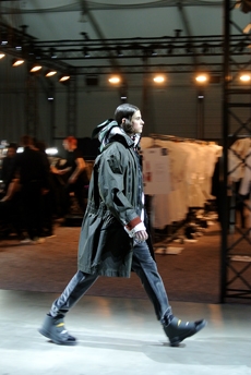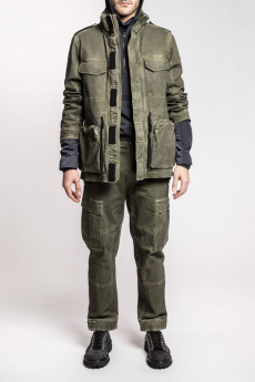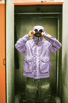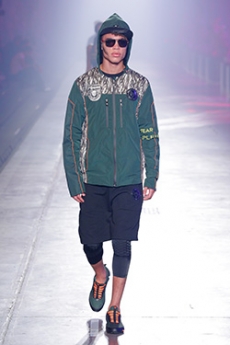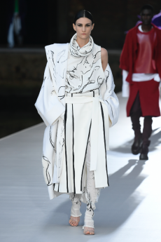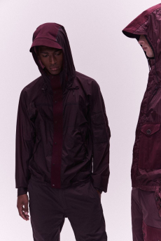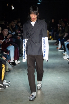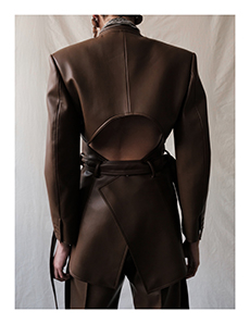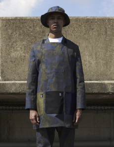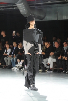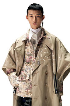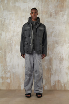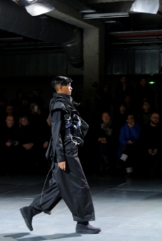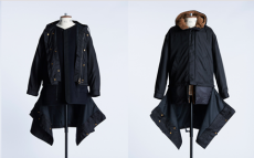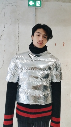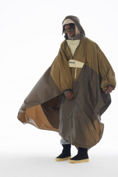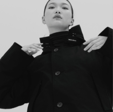 Designer Shangguan Zhe's latest collection holds man's relationship with space and chemistry at its core, proposing garments that overlap with the idea of consuetude. Military uniforms with raw edges, primitive top-stitched suits and parkas, jumpsuits with industrial strap and bio-chemical protections, just a few examples of Zhe's research-based project. Zhe, indeed, created his own textiles mixing industrial materials and aramid fibers, usually used for spacesuits to give birth to his undoubtedly contemporary and updated vision.