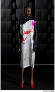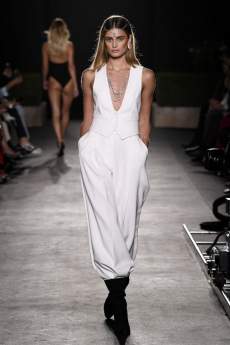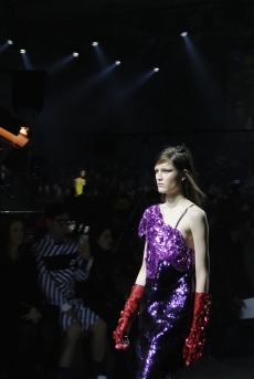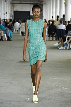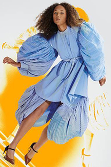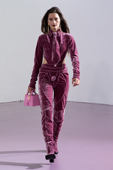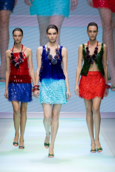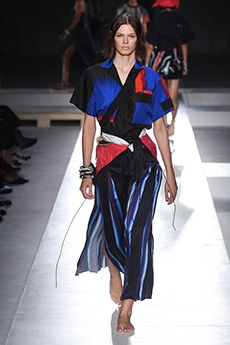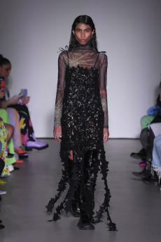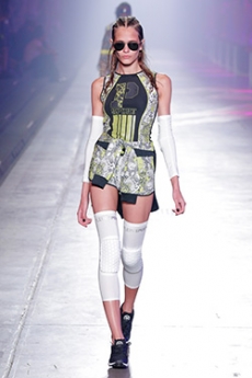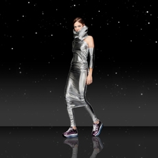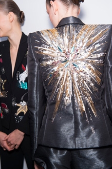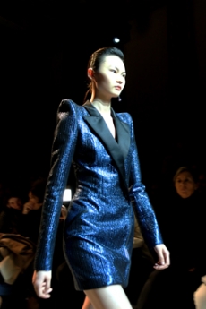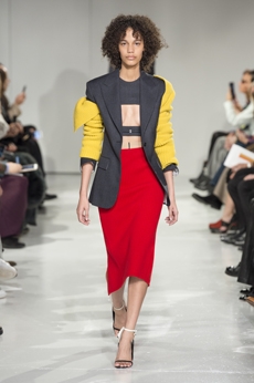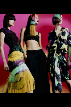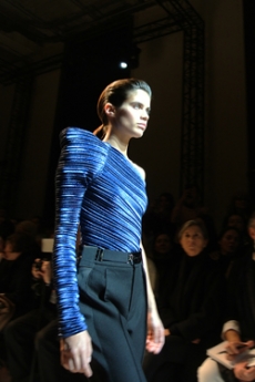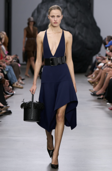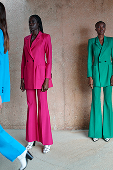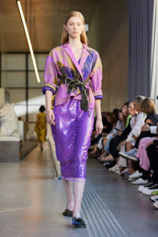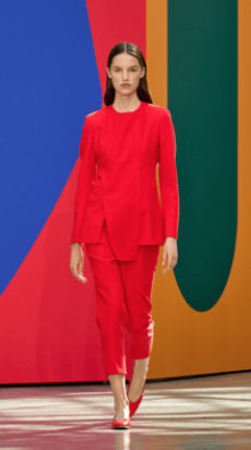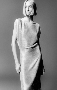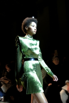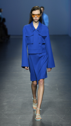David Koma created a collection constellated mainly with evening looks. Vertiginous minidresses with cut-out star details at the bottom hemline or embroidered on the bodice, hourglass silhouettes with pleated lamé in acid green and electric blue, a long white gown with pleated contrast silver lamé. But also power suits with sharp sculptural shoulders in contrasting colours, pants-blazer combo in white, silver, black.