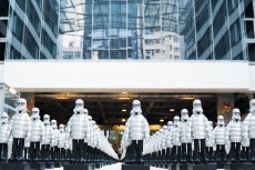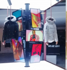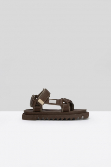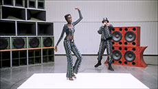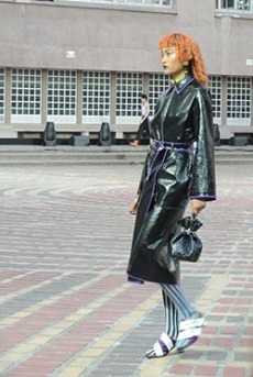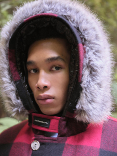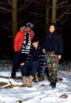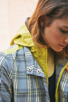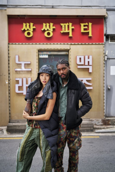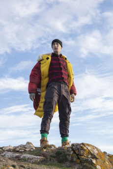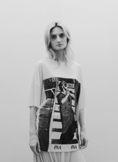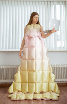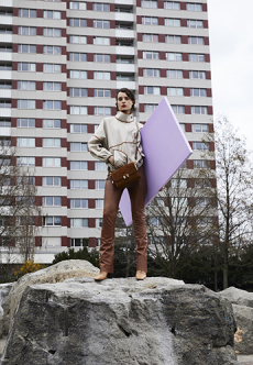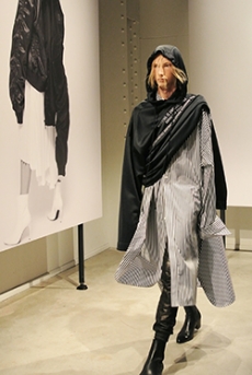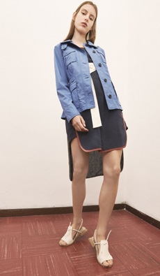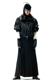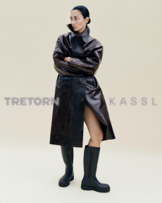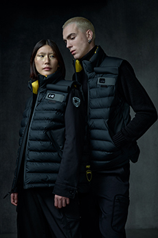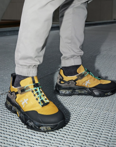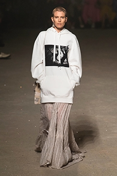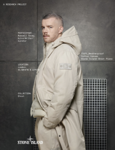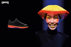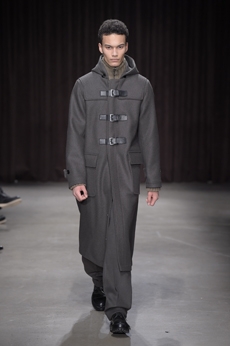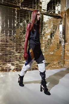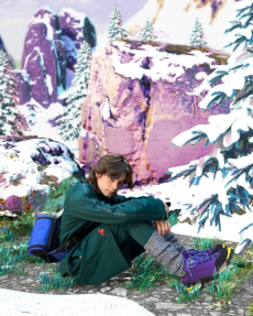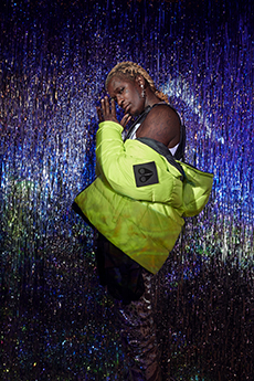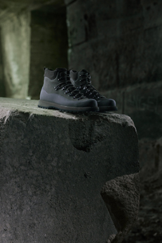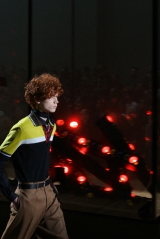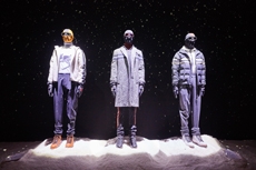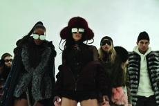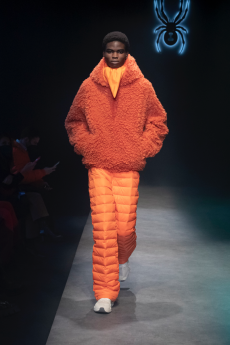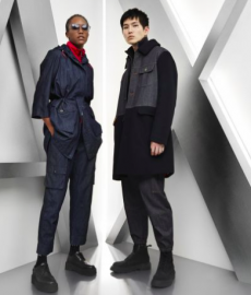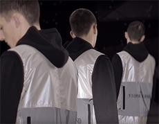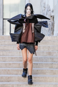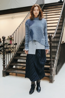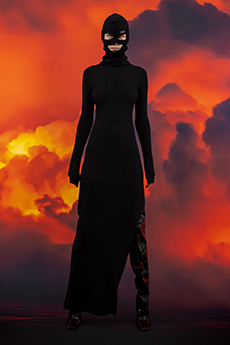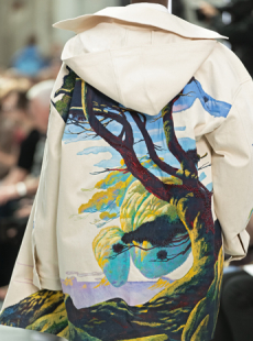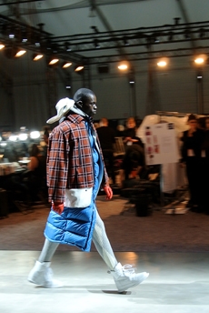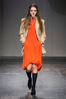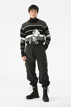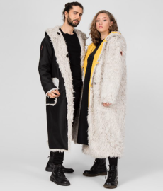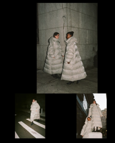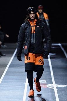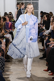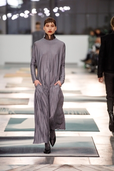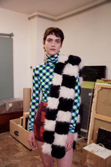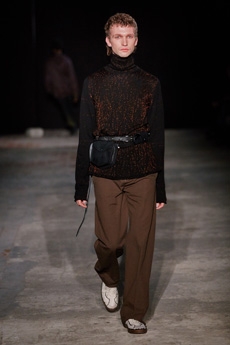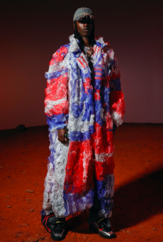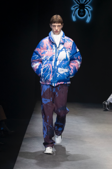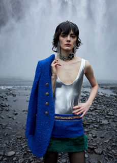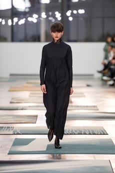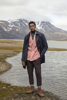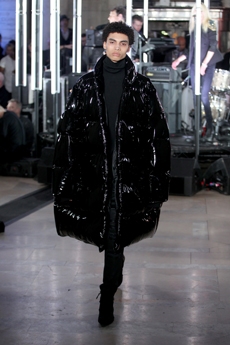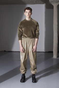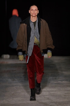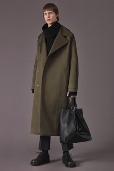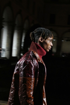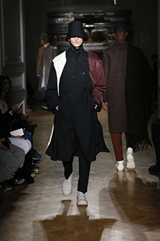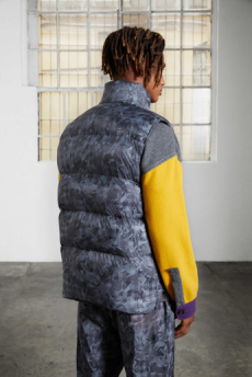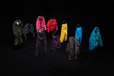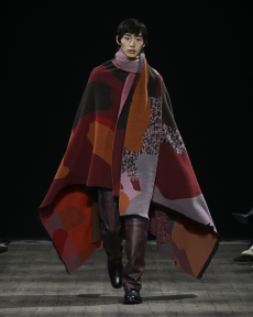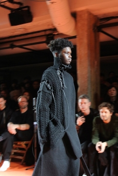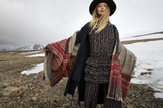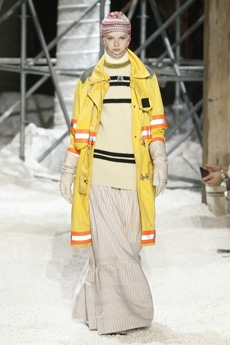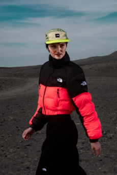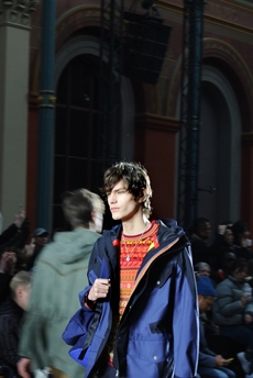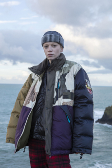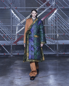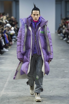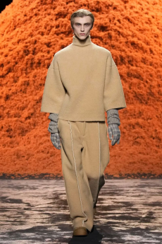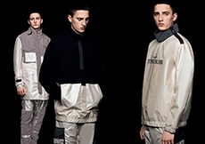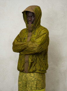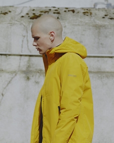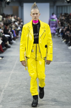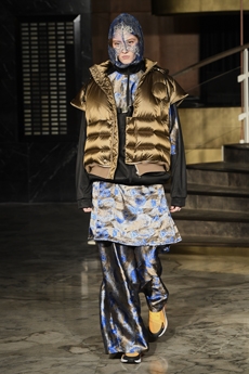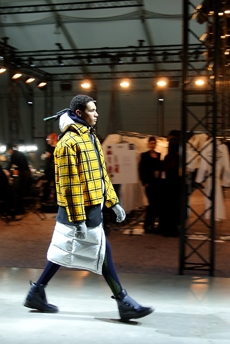 Inspired by 'Independent People' by Nobel Prize winning author Halldor Laxness, the collection plays with the colors of Icelandic landscapes ranging from chalk grey to yellow. Shades of ice, brown and lava are chosen to give life to coats, parkas, heavy felts and comfortable shapes designed to face the harsh temperatures of Nordic winter in style. Military cotton and heat-sealed waterproof wool make coats and blousons, put together by big Velcro stripes.The collection's prints are a new take on glitch art that plays with disintegrated images.