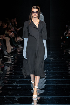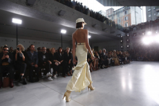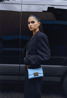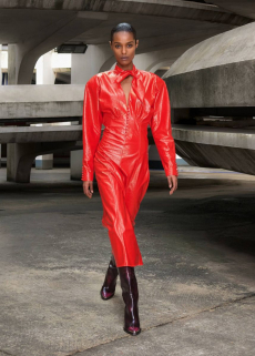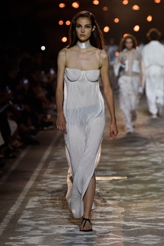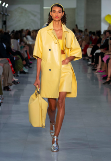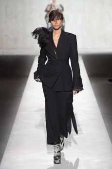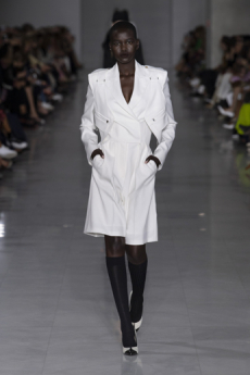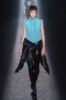 Natasha Poli storming the catwalk in a blue patent leather blazer with arched shoulders and slim pantsuit. The atmosphere was fierce and as the models powerfully marched in one after the other, the message that creative director David Koma surely had in mind was clear: effortless and daring, Mugler’s woman will not be unnoticed.