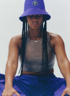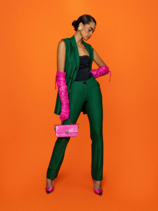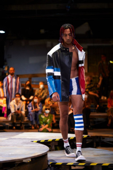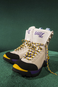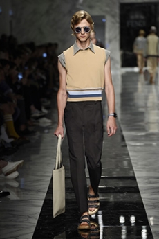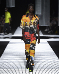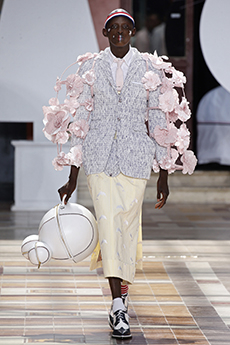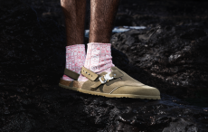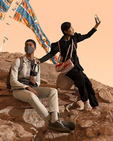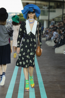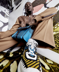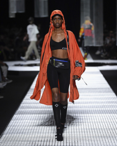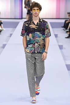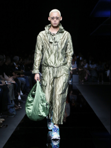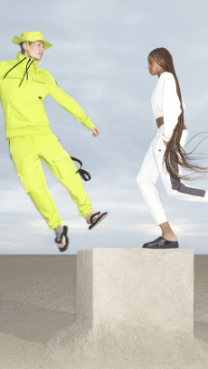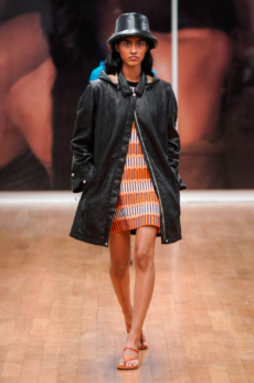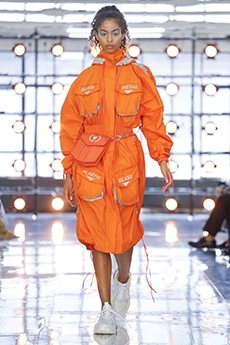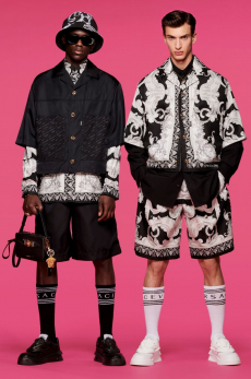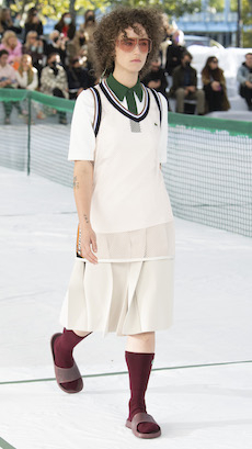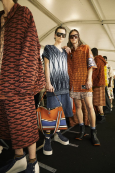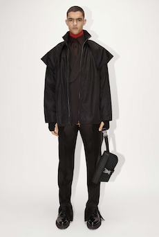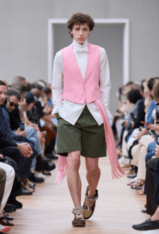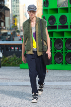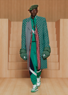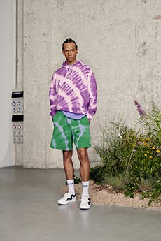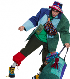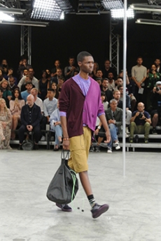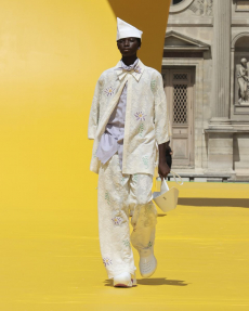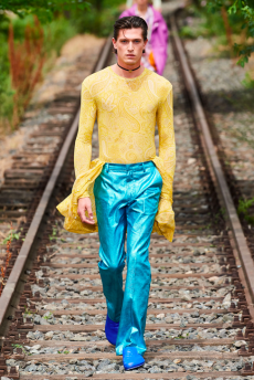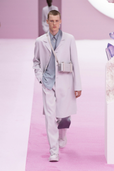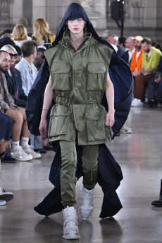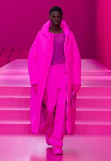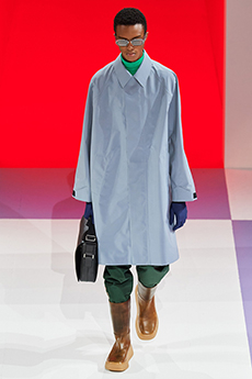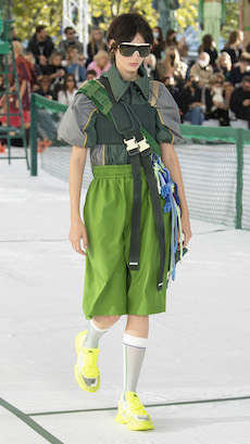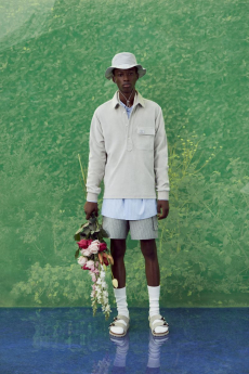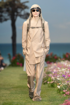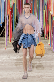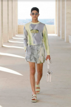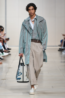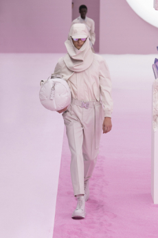 Silhouettes are completed with accessories like visored bucket hats, pop military backpacks and high-top sock sneakers in a color palette that is everything but boring.