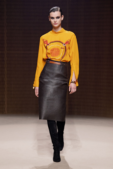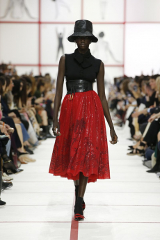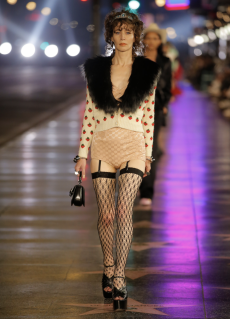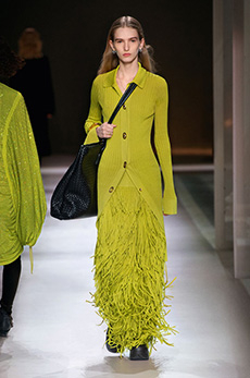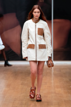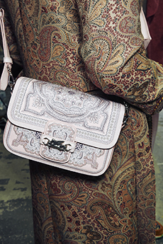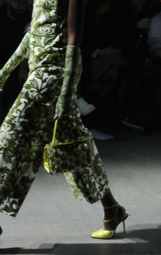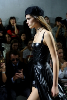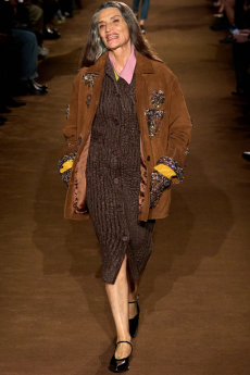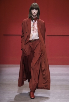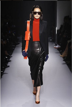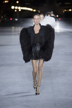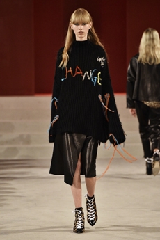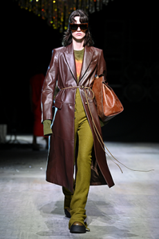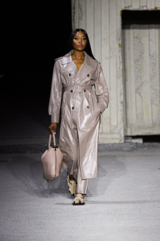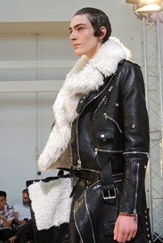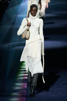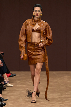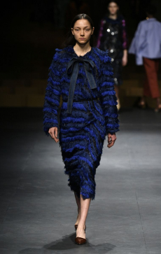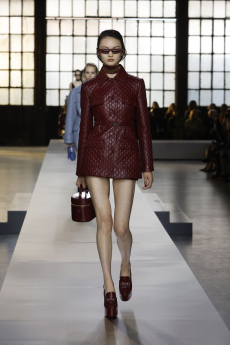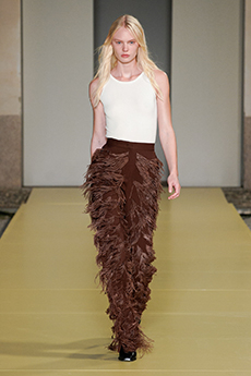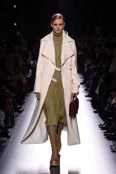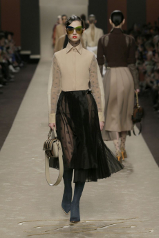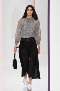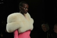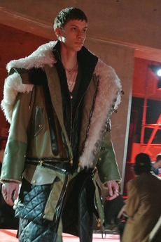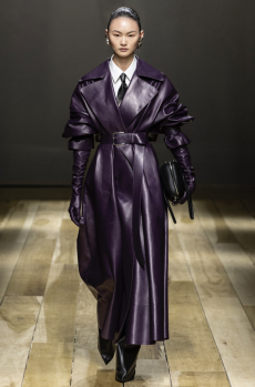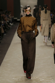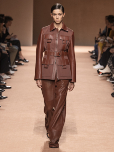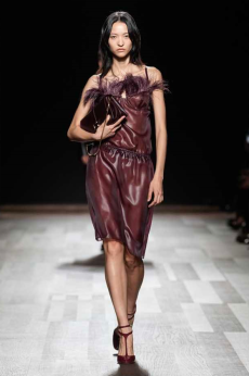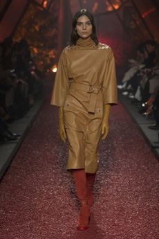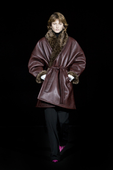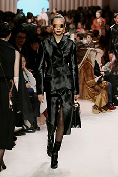 This may come as no surprise but beautifully-treated leather was central to this collection: super polished or crackled giving the impression of age and wear. What was perhaps more noteworthy is the attention that designer paid to fur this season. Short-sleeved, patch-worked jackets were paired with relaxed, cropped flares but could up the ante when thrown over an evening dress.