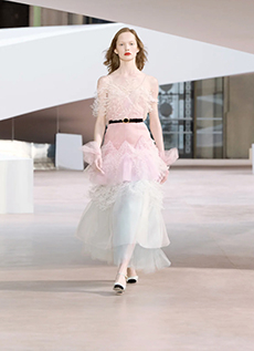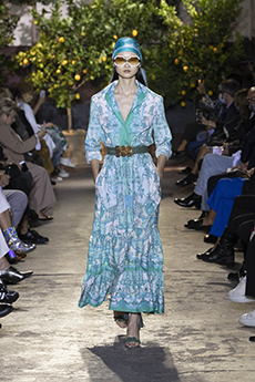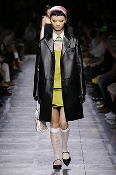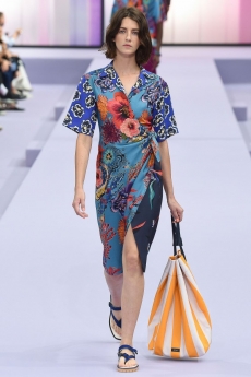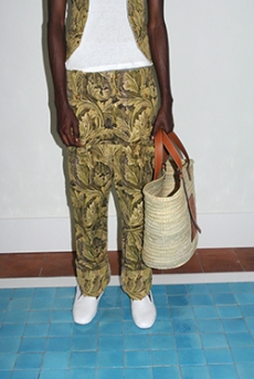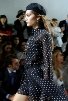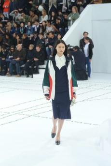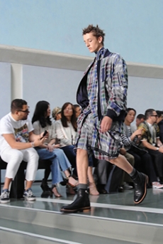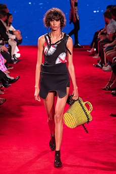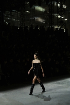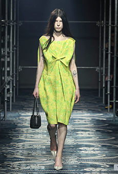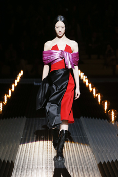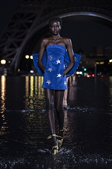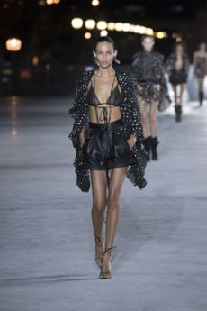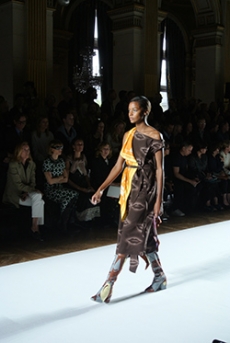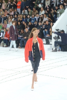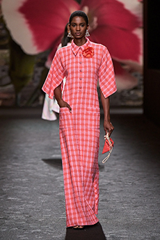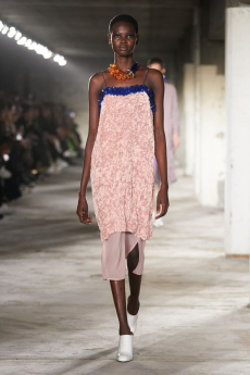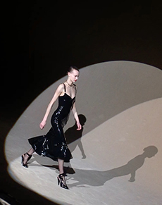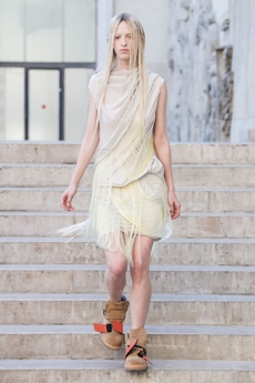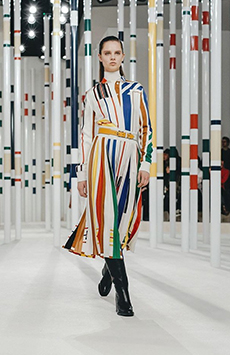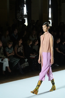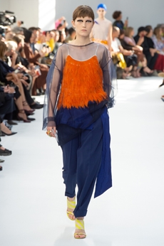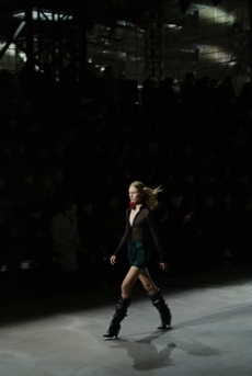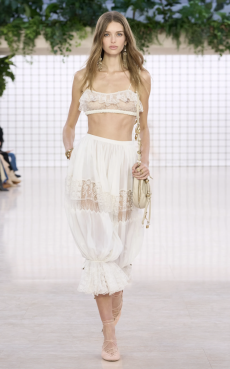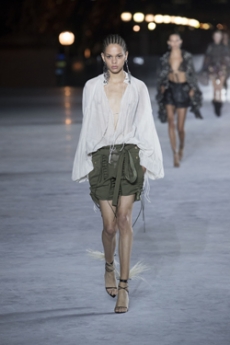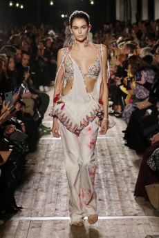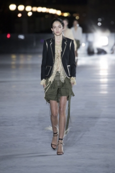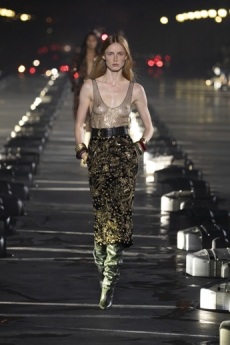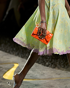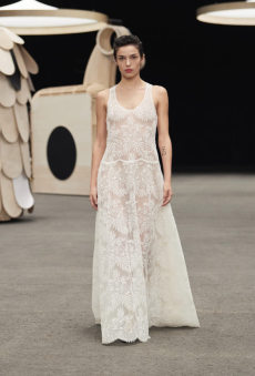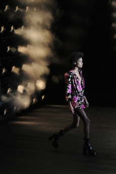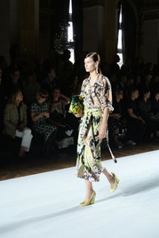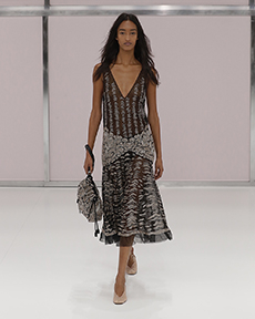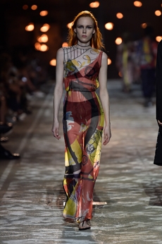 Ghesquière's evening wear offering moved away from last season's dramatic naked dresses. He opted instead for knee-length slip dresses with elaborate pleats, lace insets, sheer details and fabrics with clashing prints in an attempt to infuse the collection with an easy-going, laid-back attitude.