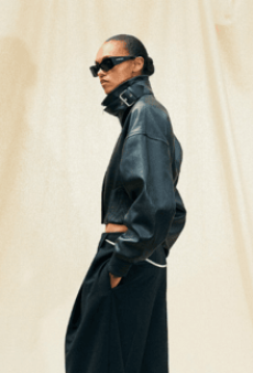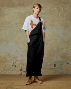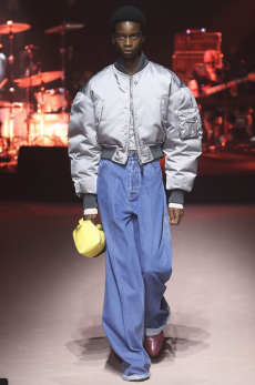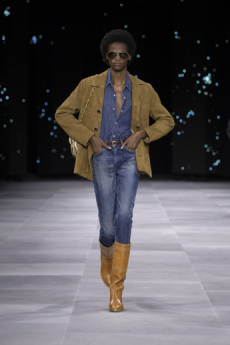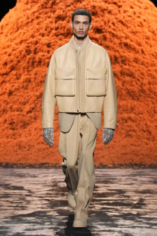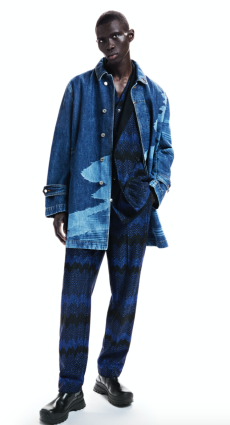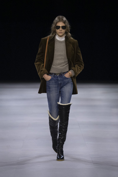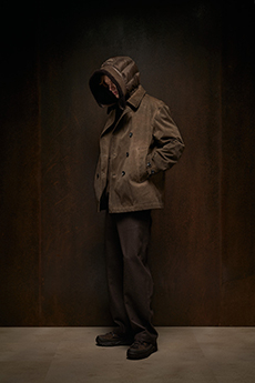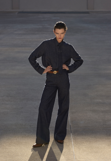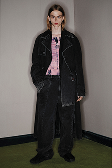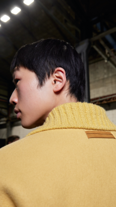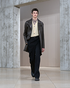 Proportion and volume are central to the collection’s attitude. A broad-shouldered wool overcoat is elongated and dramatic, while a cropped, padded utility jacket in plush cotton velvet brings structure in a deep winter brown. A canvas workwear jacket with a contrasting velvet collar bridges practical roots with refined finish. Pinstripe suiting is rendered oversized and fluid, and trousers in denim, cotton, and velvet are cut long to stack neatly at the ankle, naturally pairing with the season’s leather boots.