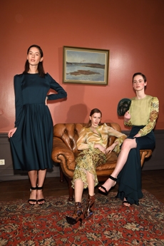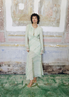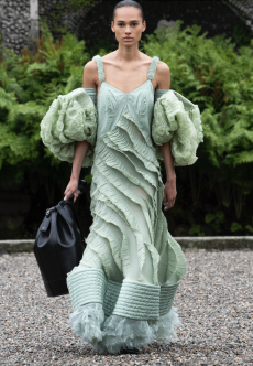This long and feminine silhouettes underlining the female body recall the English mediaeval soft dressing as found in 16th and 17th century art depicting the beautiful tragic stories of Lady of Shallot and Queen Guinevere.