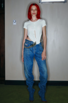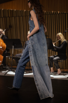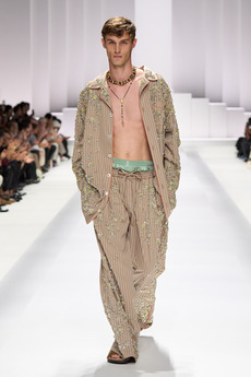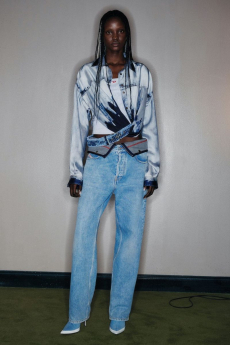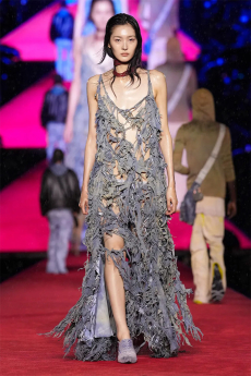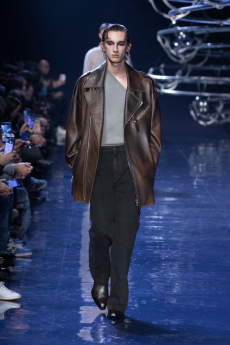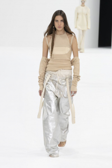 The progression unfolds like a score: first, a blank overture of elongated dresses, loose tailoring, cargo pants, and flowing shirts. Then, a bolder interlude: sponged leathers, acid-etched denim, airbrushed knits. Finally, a crescendo of sinuous shimmer, sculptural and silvery, closing the arc in luminous fluidity.