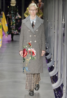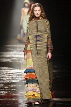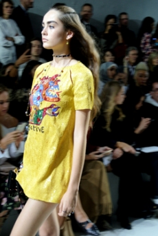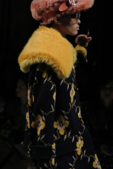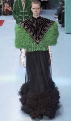 It was not just a spectacle. It was a beautiful collection where the clothes stood strong, masterly styled, layered and carefully balanced. Knitwear in long dresses, tunics and sculptural coats as out from Coppola’s brash “Marie Antoinette”. Fur trimmed puffa jackets and long velvet skirts. Sweatshirts with metal studs, embroidered with unicorns and insects. A beautiful crimson red, moss green, shades of cerulean blue and a bold yellow, painted this beautiful story. A story of humanity itself. The platform shoes and boots, reminiscent of the faun’s goat legs pushed this narrative image even further, in an enchanting atmosphere.