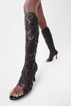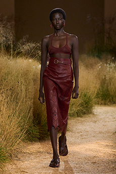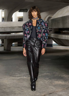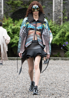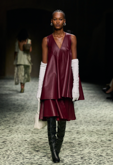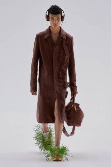 In times of instability, Sportmax looks outward - and upward. The collection is a study in contrasts: dreamy yet grounded, architectural yet fluid, sensuous yet serene. Organza takes on unexpected roles - lining tailoring, shaping trench coats, and floating over trousers with ghost-like grace. Meanwhile, doublé wool and glove-soft leather anchor the dream in urban functionality. Floral motifs take center stage, but not as you'd expect. Botanical patterns - painted using Japanese cosmetics - layer in transparent veils, creating illusions in motion. Hand-moulded leather flowers emerge as halter tops and charms, tactile and surreal.