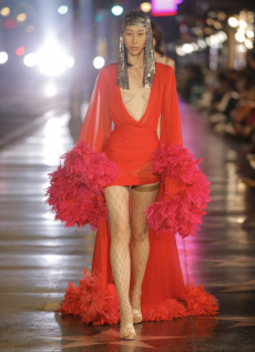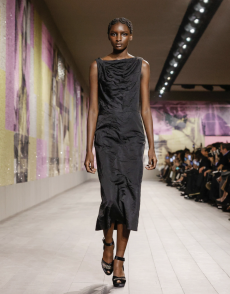 The collection navigates this delicate balance with fluid silhouettes that shimmer with lightness, while sharp cuts and precise details preserve Givenchy’s signature architectural sophistication. Fabrics float and cling in turns, as Burton channels a refined strength that feels both intimate and commanding.