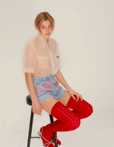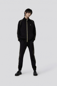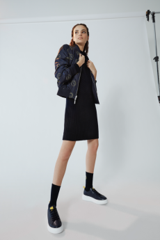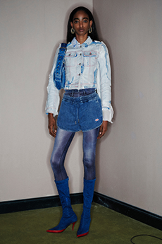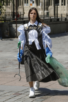 The collection paired fashion with sustainability featuring bi-colour cropped GmbH biker jackets reworked from recycled, reversible Helly Hansen puffer coats, cropped jersey hoodies and fine knit athletic bodies of partially recycled fibres. A shot of glamour is given by tight lycra and velvet long-sleeved jumpers in a color palette inspired by artist Alexandra Bircken. Moreover traditional carpenter’s guild trousers and gold embroideries enrich the outfits for an even more personal touch.