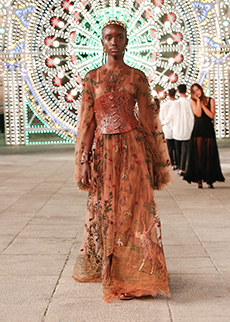 Sarah Burton gives us a full vocabulary of spectacular fabrics, embroideries, finishes, enabling us to dream about the rich landscape of myths and cultures of Cornwall. It’s as we could see the wind blowing on its coast, the ribbons and the hypnotic vision of million of threads floating in name of life.
