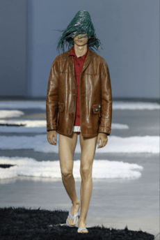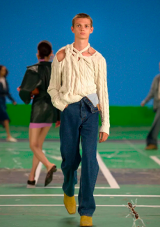A small trumpet as an earring, a shopper completely covered in off-white cable knit wool, a thin leather belt with an ominous brass nose on its centre. The collection of objets trouvés that populated Loewe Menswear Fall/Winter 2017 is not a new element for the quirky mind of creative director Jonathan Anderson.