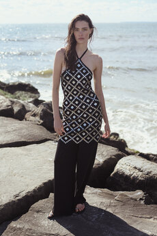 In a universe of flux, definitions lose strictness, and meanings expand and change. Here, the strong-meets-soft duality that defines Sportmax lives in every detail: polka dots and pinstripes form the brand’s visual language, while grid or patchwork laces and embroidered trims create delicate layering opportunities. The classic pinstripe, elevated by trompe-l’oeil tailoring, emerges with fluid authority, while crepe jersey dresses channel swimwear elements, blurring boundaries between evening wear and packable practicality.
